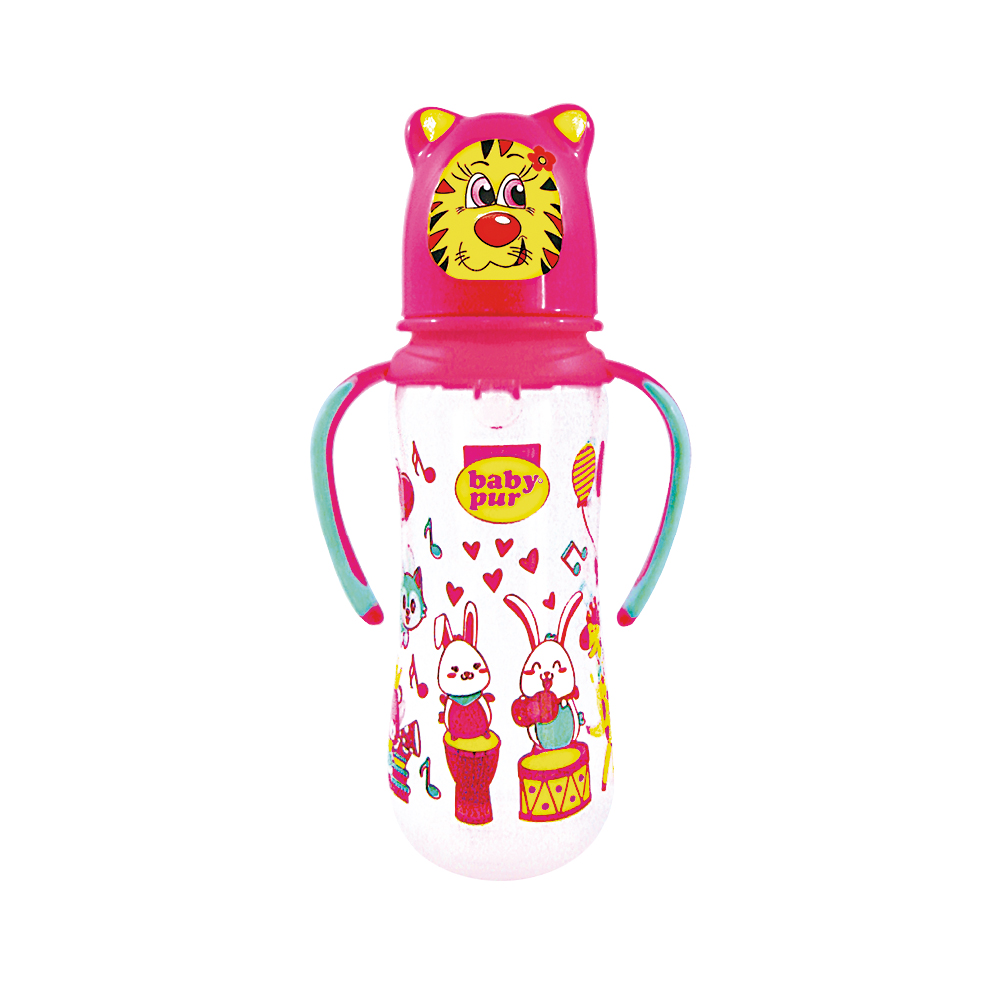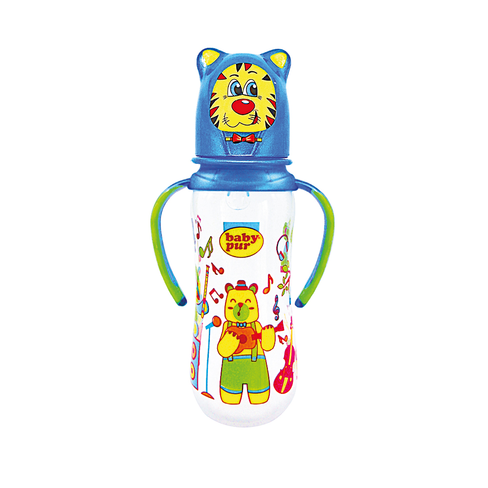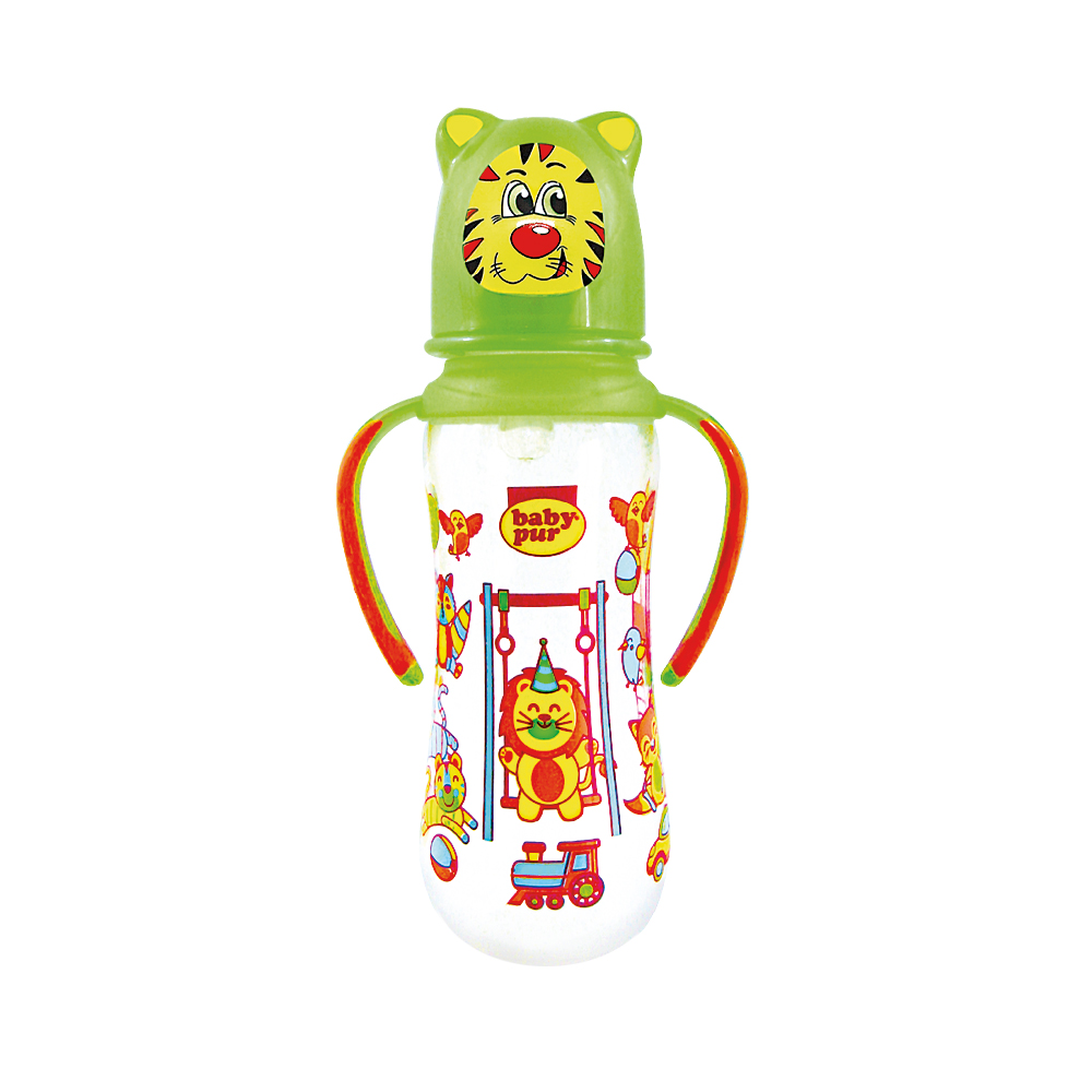 Biberon avec couvercle amusant et double anse.