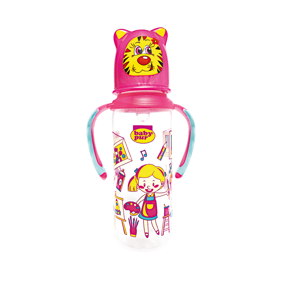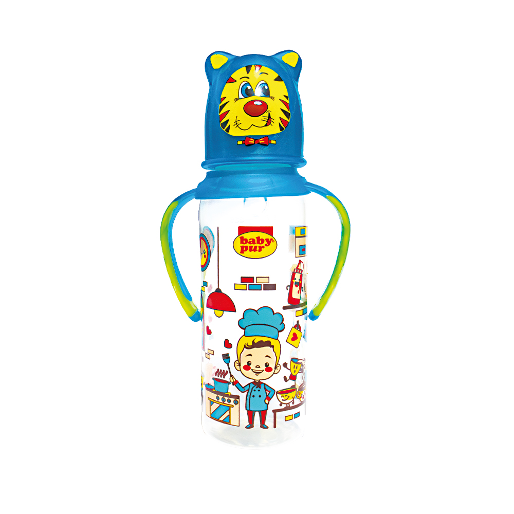 Biberon avec couvercle amusant et double anse.